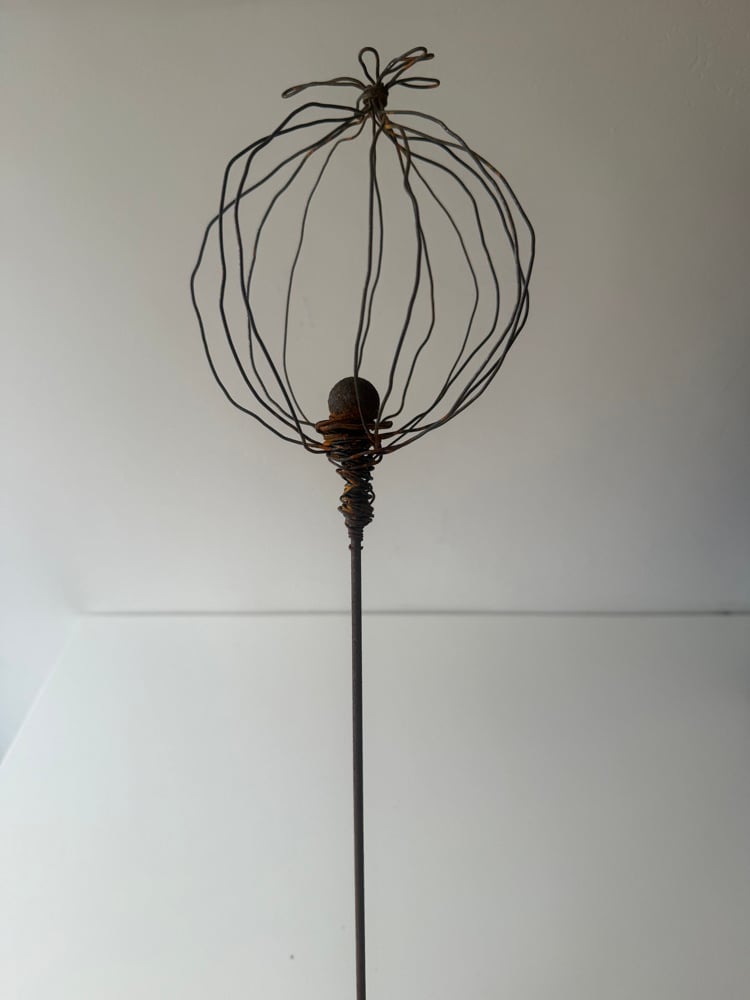single outdoor garden poppy seed head stake.